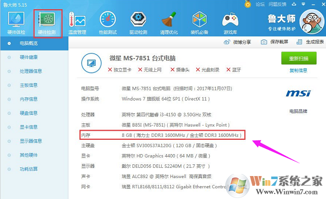 1、安装鲁大师,成功后,打开鲁大师软件,可以看到电脑概览中清晰的显示了各个硬件的具体信息,其中包含了内存的频率。