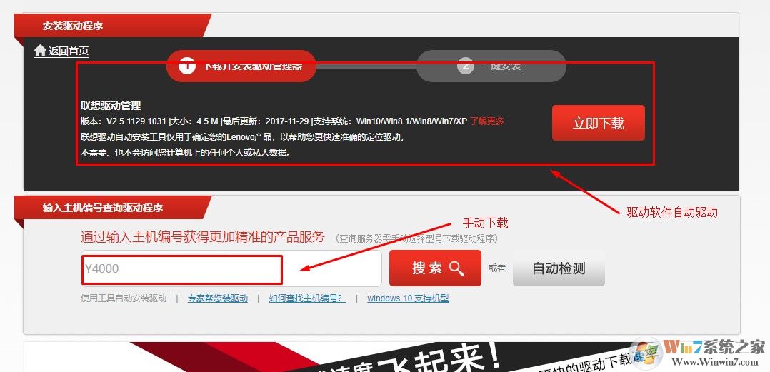 2、选择手动下载网卡驱动的话输入主机编号即可,也可以直接下载联想提供的驱动程序管理软件进行自动驱动。