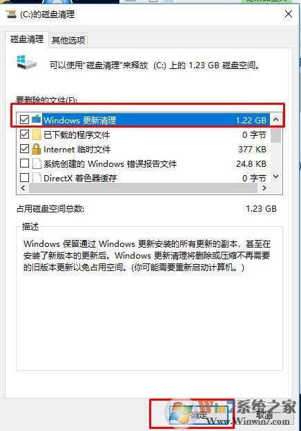 3、这时我们可以看到,Windows更新清理 有1.22G的文件,勾选后,点击确定;