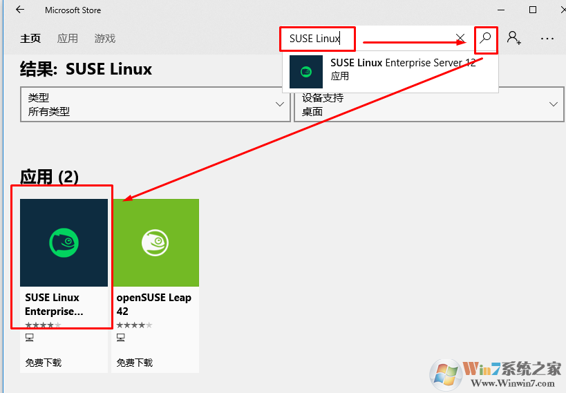 2、在搜索中输入自己想要的Linux系统的版本,如Ubuntu、SUSE Linux和Fedora。当然win10系统目前也就至此这3个版本。