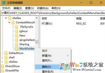 步骤2、打开注册表管理器后,依次展开并定位至展开HKEY_CLASSES_ROOT\Directory\Background\Shellex\ContextMenuHandlers,然后点击展开ContextMenuHandlers,不管有多个项目,只保留New这一项就够了,其他的通通使用鼠标右键菜单删除