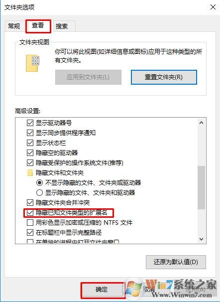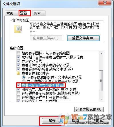 2、然后点击查看标签,在下面的高级设置中,找到”隐藏已知文件类型的扩展名“,勾选,然后点确定就可以了!