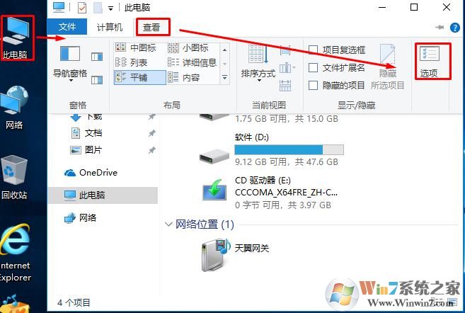 1、打开桌面上的“此电脑”,或随便一个文件夹,然后点击 查看 再点击 选项,如下图所示;