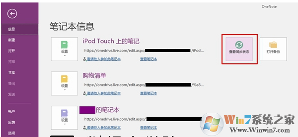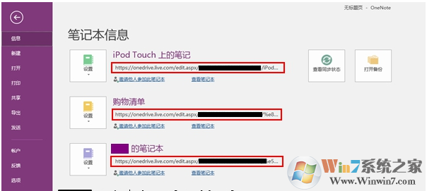 在OneNote 2016中,点击Robbin功能区中的文件-信息,你将在此看到你所有的OneNote笔记,在这些笔记的下方,你可以看到它们对应的链接。