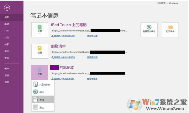 点击Robbin功能区中的文件-信息,你将在此看到你所有的OneNote笔记,选择你的目标笔记,点击它前面的设置按钮,在它的下拉菜单中点击关闭。