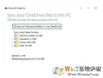 接下来,您会被要求选择OneDrive文件和文件夹,你想同步。 默认情况下,所有的文件和文件夹会从你的云帐号同步到PC上的本地存储位置,但是如果你想更选择性的这一点,你可以取消勾选旁边的框“同步所有文件”,然后从中选择单个文件夹。