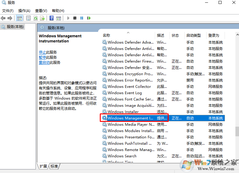 2、找到Windows Management Instrumentation服务,此服务与用户界面有关,停止该服务;