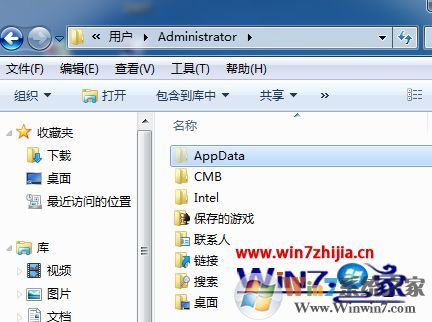2、同样在win7系统C盘中,点击进入“用户”文件夹,选择“administrator”文件,接着双击隐藏文件夹Appdata;