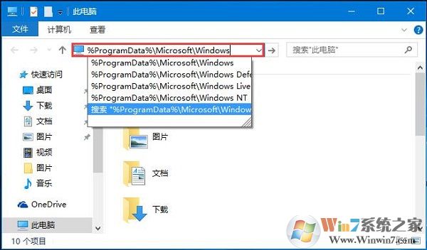 1、打开“此电脑”,在地址栏中输入:%ProgramData%\Microsoft\Windows 并按下回车键;