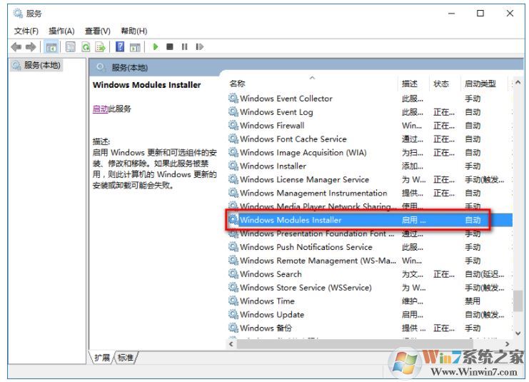 2、在服务(本地)窗口找到:Windows Modules Installer 服务,查看是否被禁用;