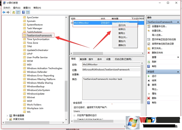 4、右侧可以看到名为MsCtfMonitor的任务计划程序,右键单击MsCtfMonitor,选择“运行”(如图)。当MsCtfMonitor任务计划程序状态变为“正在运行”,输入法切换即恢复正常。