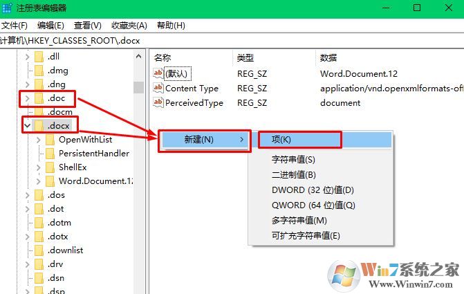 2.然后在HKEY_CLASSES_ROOT下找到.doc和.docx,右键单击新建项,命名为shellNew,然后在建立的项中新建字符串,命名为NullFile,值为空。
