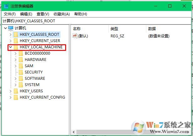 2、进入注册表,找到“HKEY_LOCAL_MACHINE”,请根据下图指示,点红色框内箭头所示的文件夹前的+按扭