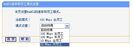 解决办法:尝试调整路由器WAN口的速率和双工模式。登录路由器管理界面,点击 网络参数 >> WAN口速率模式,模式设置 中选择 10Mbps半双工 或 10Mbps全双工 模式,点击 保存,如下图: