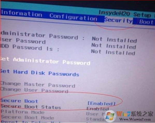 2、找到 Secure Boot 选项,并关闭它。按键盘上下左右键选择各个导航夹,一般在“Security”导航夹内可以找到SecureBoot选项,如下图所示。