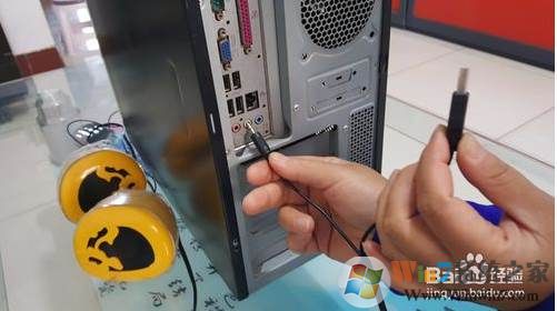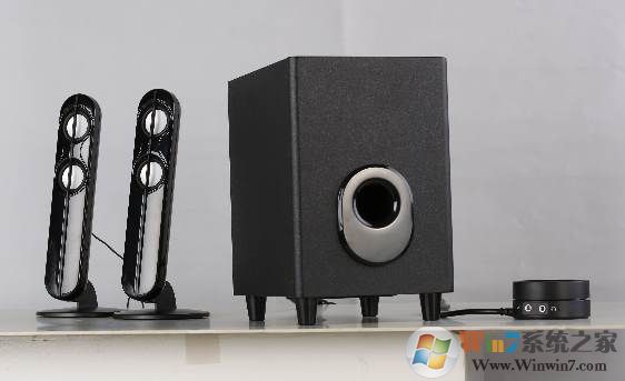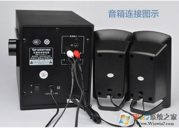 如果是2.1音箱,那么还要看看低音炮的小音箱连接是否正确,小音响连接低音炮的输出口,和电脑连接的音频线连接低音炮的输入口,如下图。