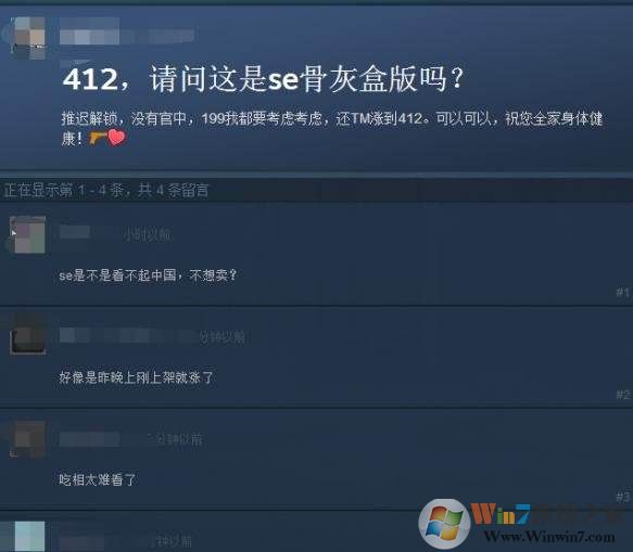 其实在Steam国区在4月27解锁时,当时售价199元,不过仅仅3小时之后,戏剧性的变化让玩家错愕:售价突然上调至412元。一时间让买了游戏和没买游戏的都炸了锅,各种平台都被刷满了差评,甚至开发商SE旗下的最终幻想7和古墓丽影崛起等都躺着中枪……