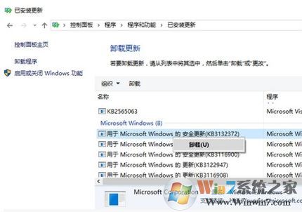 4、在列表中,找到名为【KB3132372】的更新,右键选择【卸载】;