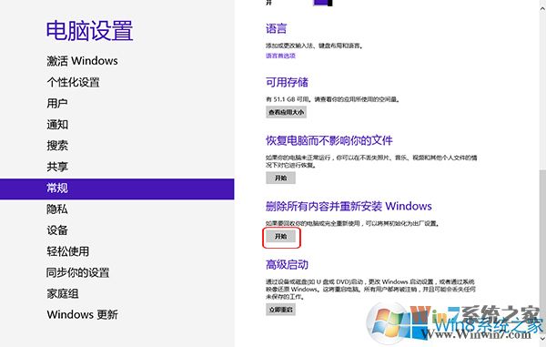 第三步、在新的窗口的左侧选择“常规”,点击右侧的“删除所有内容并重新安装Windows”下的“开始”。
