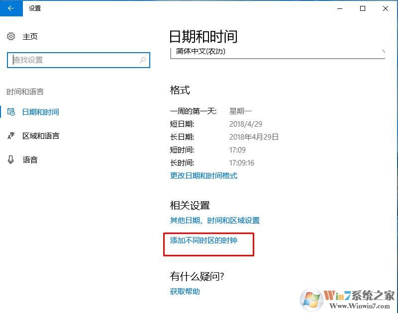3、在时间和日期下,找到“设置不同时区的时钟”;