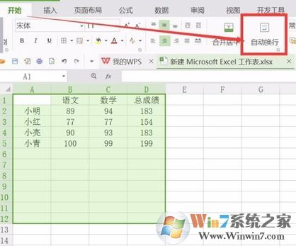2、在菜单栏“开始”里找到“自动换行”即可!