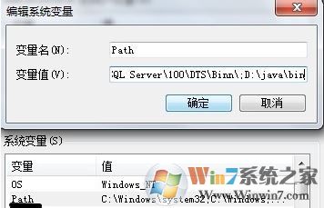 7、在系统变量中找到path,在变量值最后加一个分号“;”,再把你安装java的路径+bin复制进来,例如小编的安装java的路径是D:\java,那么我要复制进去的地址则是D:\java\bin,如图所示,点击确定