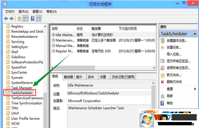 3、在该项下找到“TaskScheduler”,这个“TaskScheduler”就是管理自动维护的计划任务,禁用之后系统就不会唤醒自动维护任务了,但是相对的也会使依赖于此任务的其他功能失效。