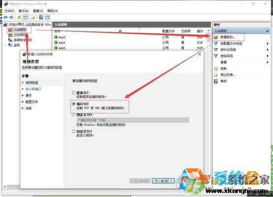 5、设置入站规则(入站规则:别人电脑访问自己电脑;出站规则:自己电脑访问别人电脑),点击“新建规则”,点选“端口”,单击 “下一步”;