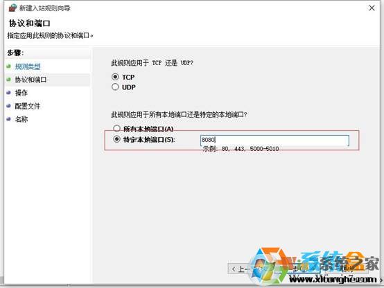 5、选择相应的协议,如添加8080端口,我们选择TCP,在我写本地端口处输入8080;