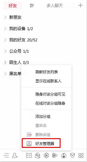 1、在联系人界面,右键点击,选择“好友管理器”;