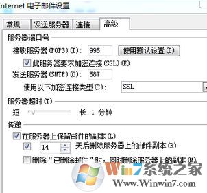 6、点击高级选项卡,pop3端口修改为995,smtp端口修改为587,勾选此服务器要求加密连接,下方加密连接类型为ssl,点击确定;