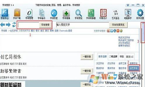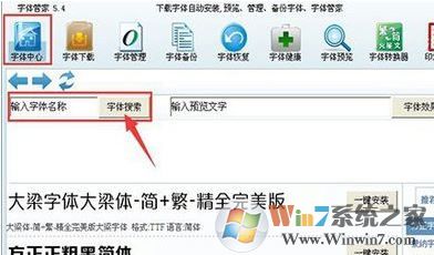 3、打开字体管家软件后,点击字体中心,然后在下面输入你想要的字体的名字,点击【搜索】即可开始搜索;
