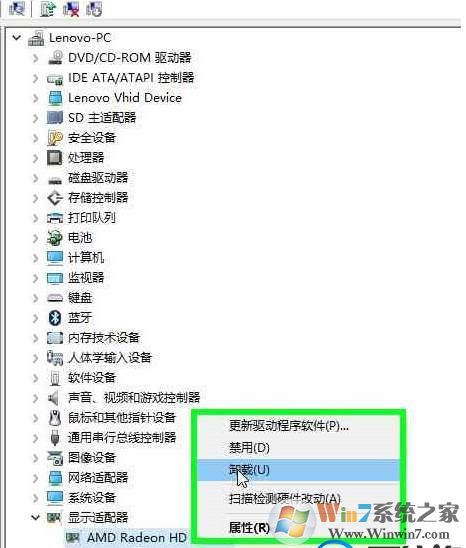 3、右键点击显卡(可能会有集显和独显两个,请精确选择)然后点击卸载设备;
