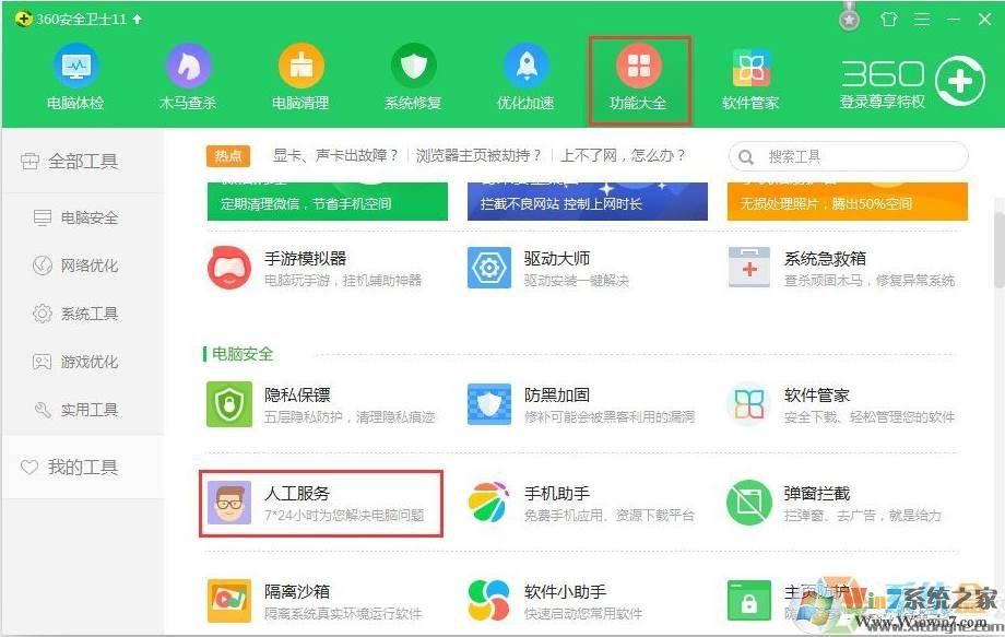 1、打开360安全卫士,单击“功能大全”打开“人工服务”;