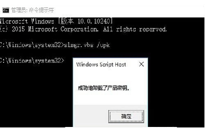 2、待打开MSDOS界面后,依次输入以下命令:slmgr.vbs /upk由于Win10正式版允许在命令提示符界面使用“Ctrl+V”进行粘贴操作,因此我们可以复制以上命令,然后在MSDOW窗口中按“Ctrl+V”或“右击”以粘贴此命令,按回车进行确定。此时弹出窗口显未“已成功卸载了产品密钥”。