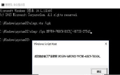 3、接着输入以下命令:slmgr /ipk NPPR9-FWDCX-D2C8J-H872K-2YT43弹出窗口提示:“成功的安装了产品密钥”。
