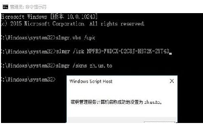 4、继续输入以下命令:slmgr /skms zh.us.to弹出窗口提示:“密钥管理服务计算机名成功的设置为zh.us.to”。