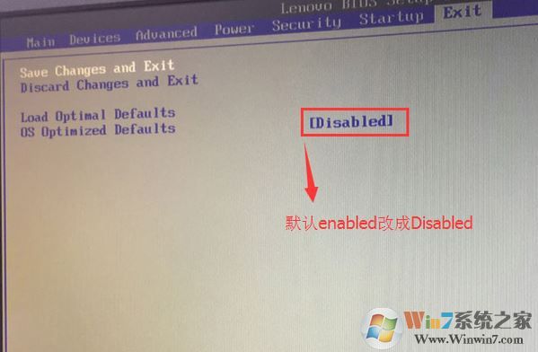 2、转到Exit,把OS Optimized Defaults设置为Disabled,如图: