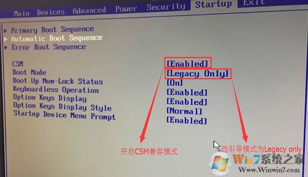 3、切换到Boot,把Boot Mode从UEFI改成Legacy only引导模式,再把csm默认disabled改成enabled,开启兼容模式,选择F10保存设置,在弹出的选项中选择YES;