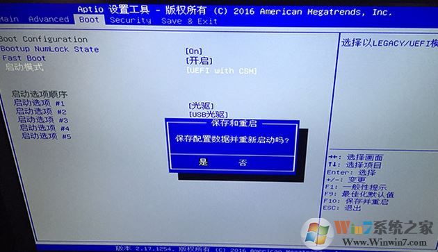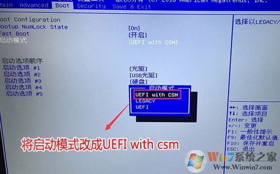 1、开机一直按按DEL进入BIOS界面,然后利用方向键上下左右来选择选项,切换到选择Boot选项,然后利用方向键的下键移动启动模式(Boot mode select)将UEFI改成UEFI with CSM如下图所示;