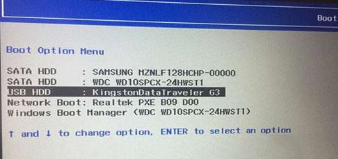4、插入制作好的U盘启动盘,重启按F12或FN+F12调出启动管理对话框,选择USB HDD识别到U盘启动进入PE,回车,如图所示: