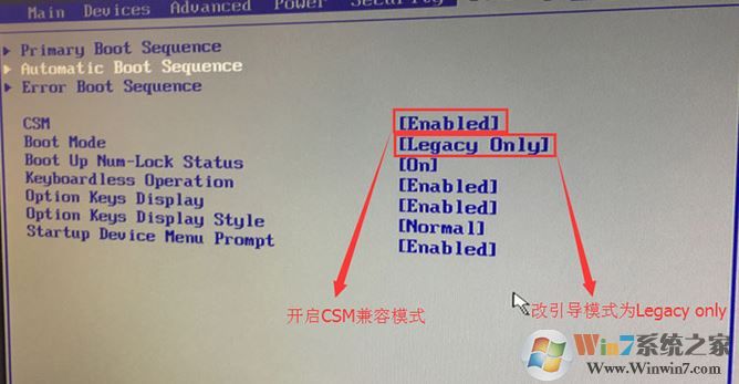 3、切换到Boot,把Boot Mode从UEFI改成Legacy only引导模式,再把csm默认disabled改成enabled,开启兼容模式,选择F10保存设置,在弹出的选项中选择YES,如图所示: