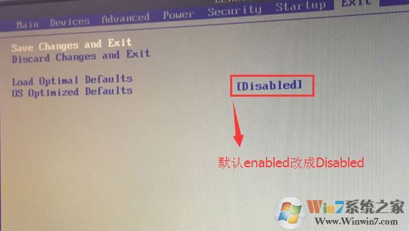 2、转到Exit,把OS Optimized Defaults设置为Disabled;
