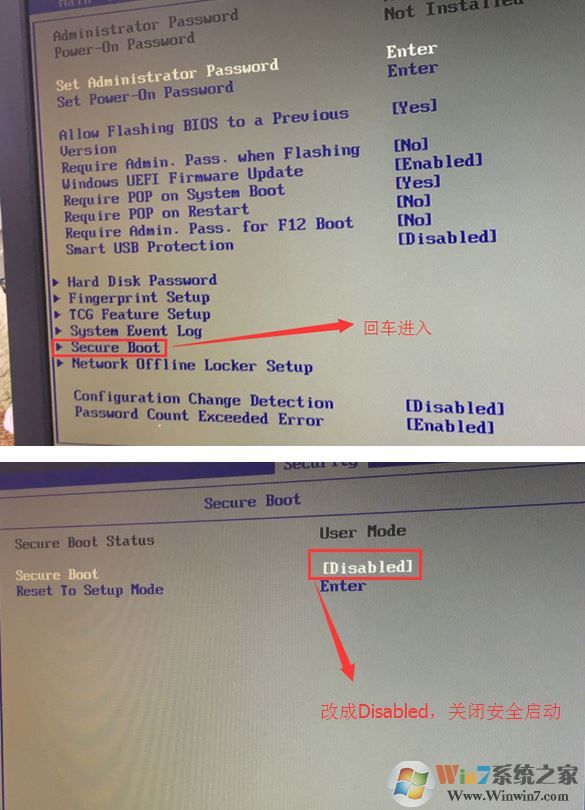 1、开机一直按F2或(FN+F2)进入BIOS,按→方向键切换到Security,选择Secure Boot回车设置成Disabled;