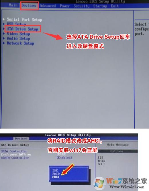 4、切将键盘移动Devices选项,把键盘移动ATA Drive Setup回车,将configure SATA as中默认的raid改成ahci模式,否则安装win7时会出现0x0000007b蓝屏,因为win7中没有集成raid硬盘驱动,然后选择F10保存设置,在弹出的选项中选择YES,如下图所示;