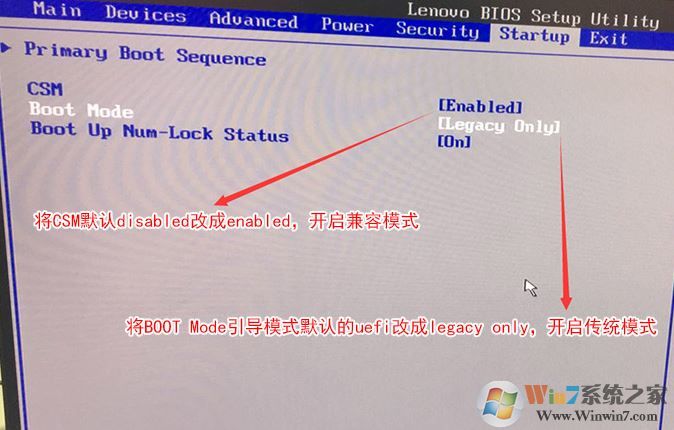 3、切换到Boot,把Boot Mode从UEFI改成Legacy only引导模式,再把csm默认disabled改成enabled,开启兼容模式,选择F10保存设置,在弹出的选项中选择YES;