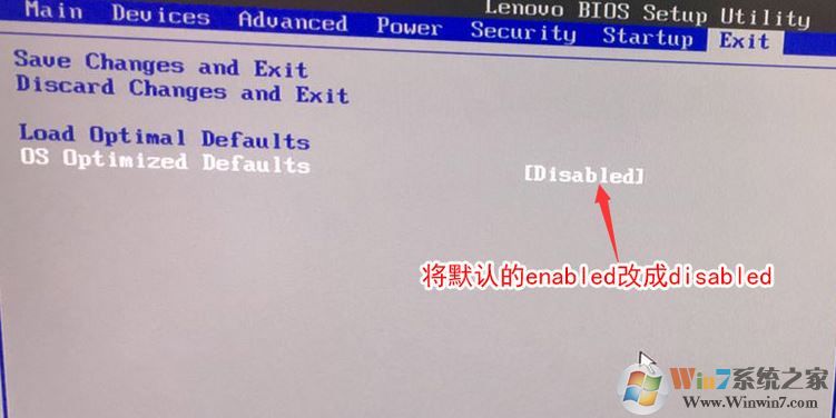 2、转到Exit,把OS Optimized Defaults设置为Disabled,如图: