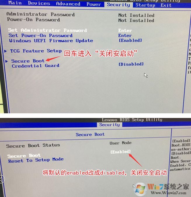 1、开机一直按F2或(FN+F2)进入BIOS,按→方向键切换到Security,选择Secure Boot回车设置成Disabled;