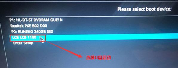 4、插入U盘启动盘,重启按ESC选择识别到U盘启动项,回车;