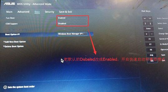 2、重启后切换到BOOT的选项,分别把fast boot和csm support由disabled改成enabled,分别开启快速启动和兼容模式,如图所示: